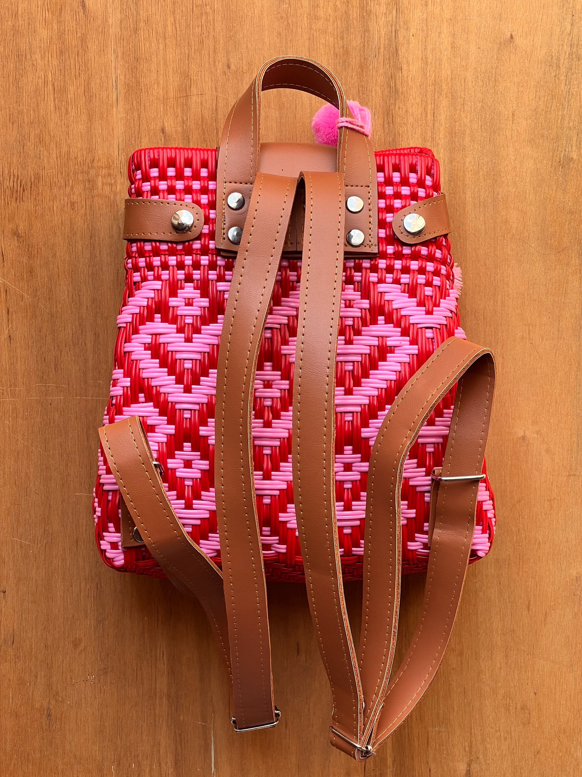 🤲🏻 Tejida a mano con plástico reciclado ♻️, esta mochila combina diseño, funcionalidad y sostenibilidad. Cuenta con detalles de piel en la tapa, agarradera y broches laterales para ajustarla según el espacio que necesiten.