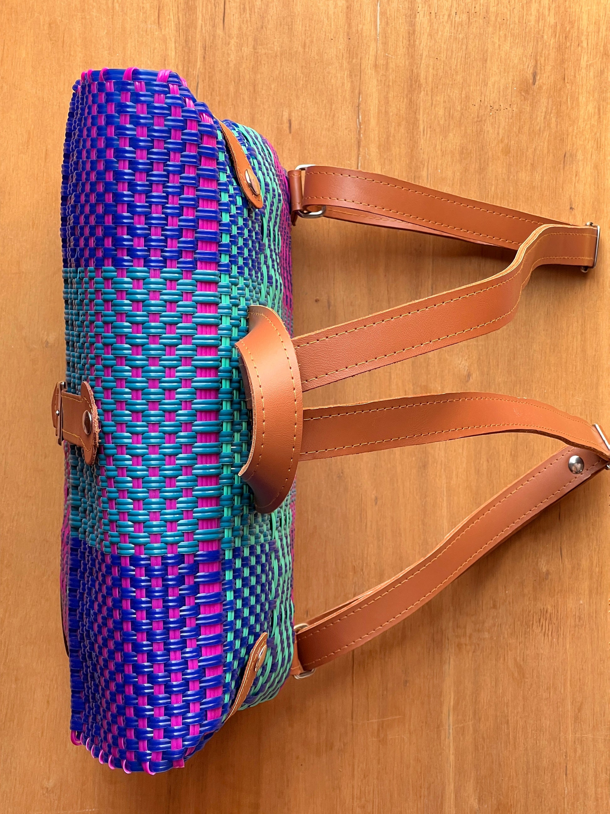 • Tejida a mano con plástico reciclado ♻️ y detalles de piel