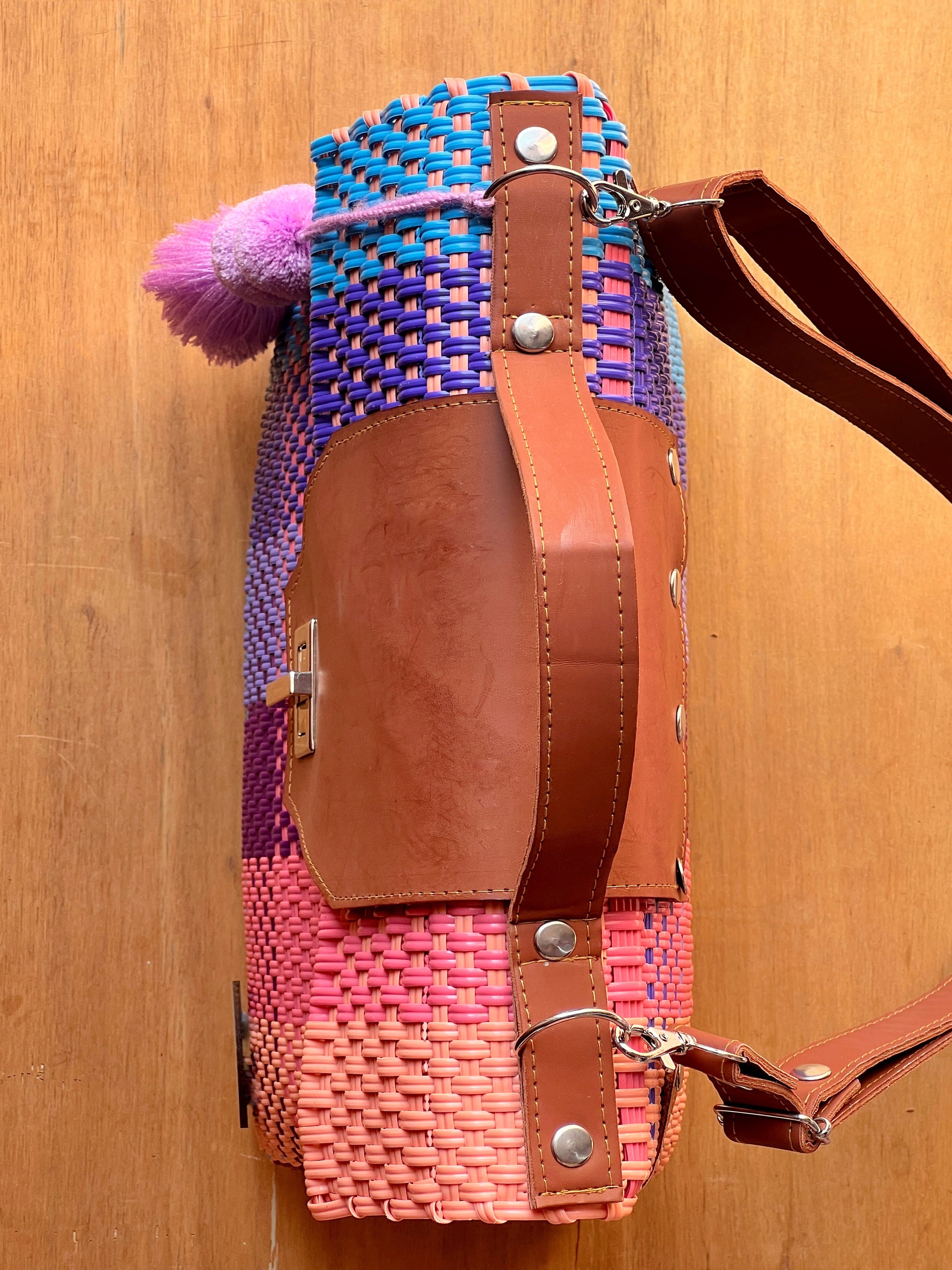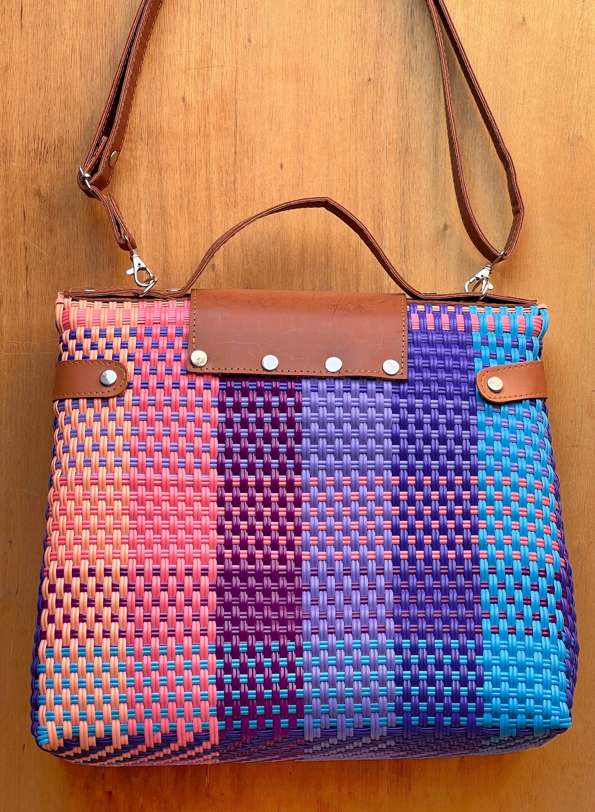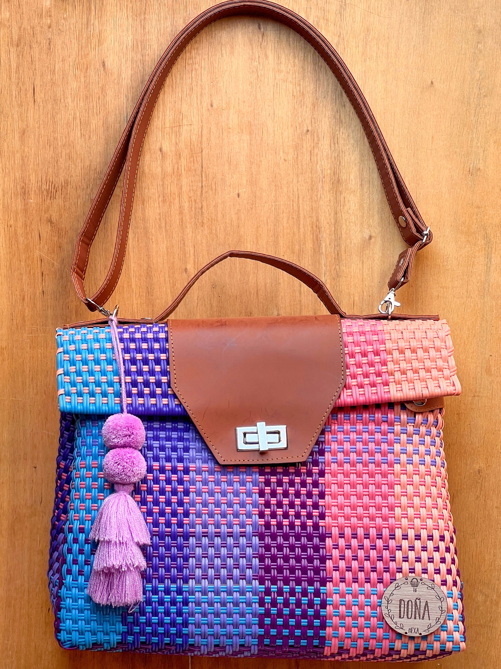 Tejida con plástico reciclado ♻️por fuera con detalles de piel, también viene con una bolsita cubre polvo para nunca se te maltrate👌🏻💕