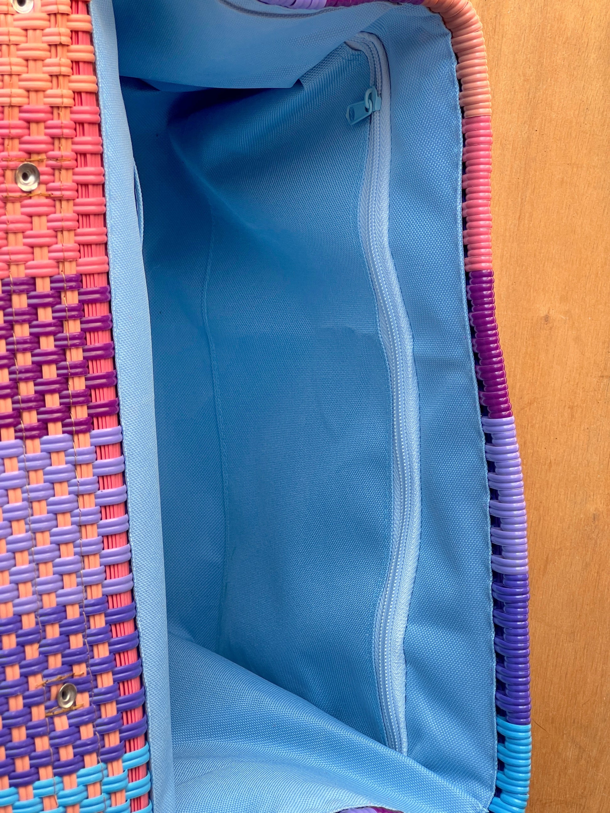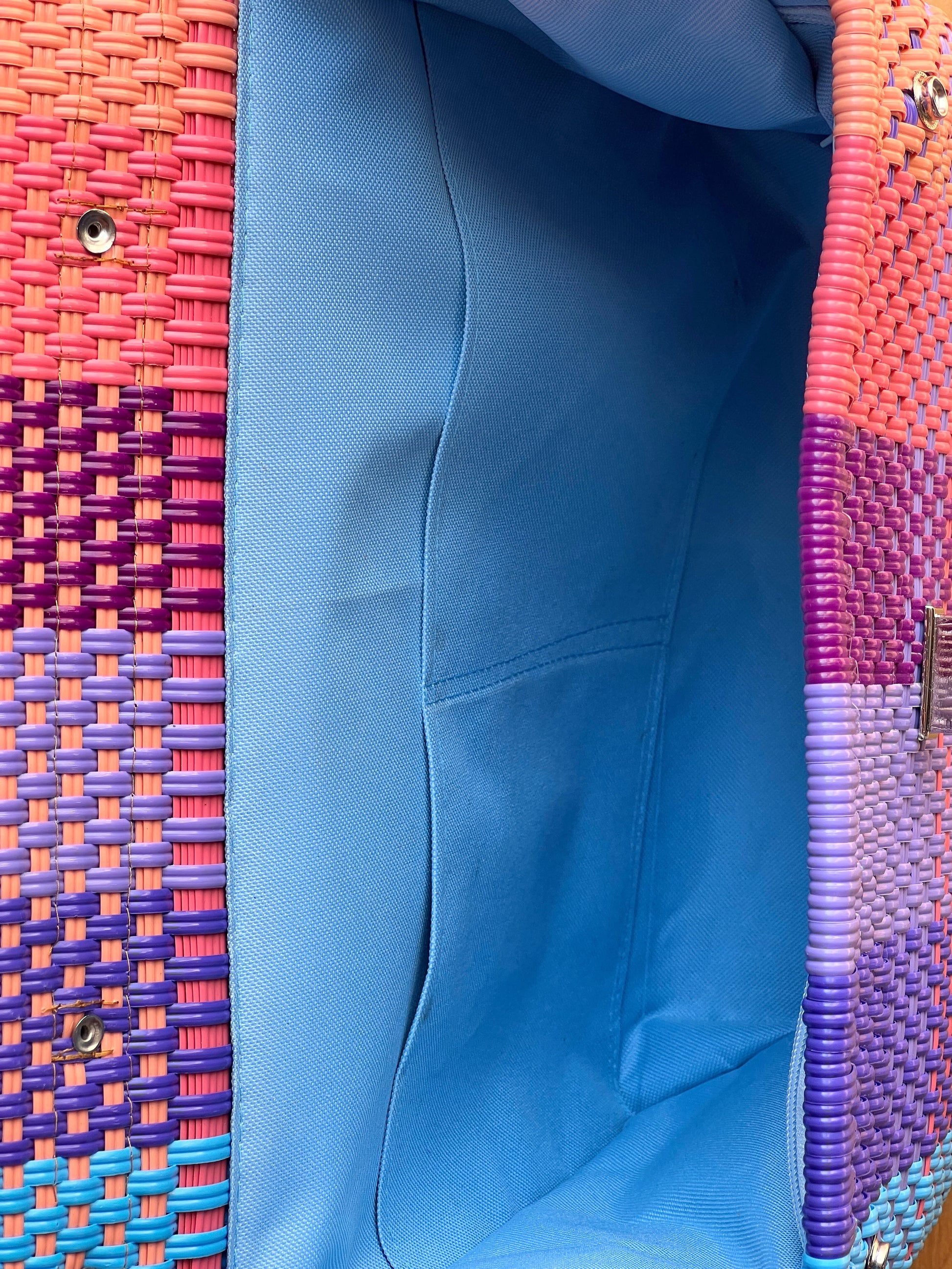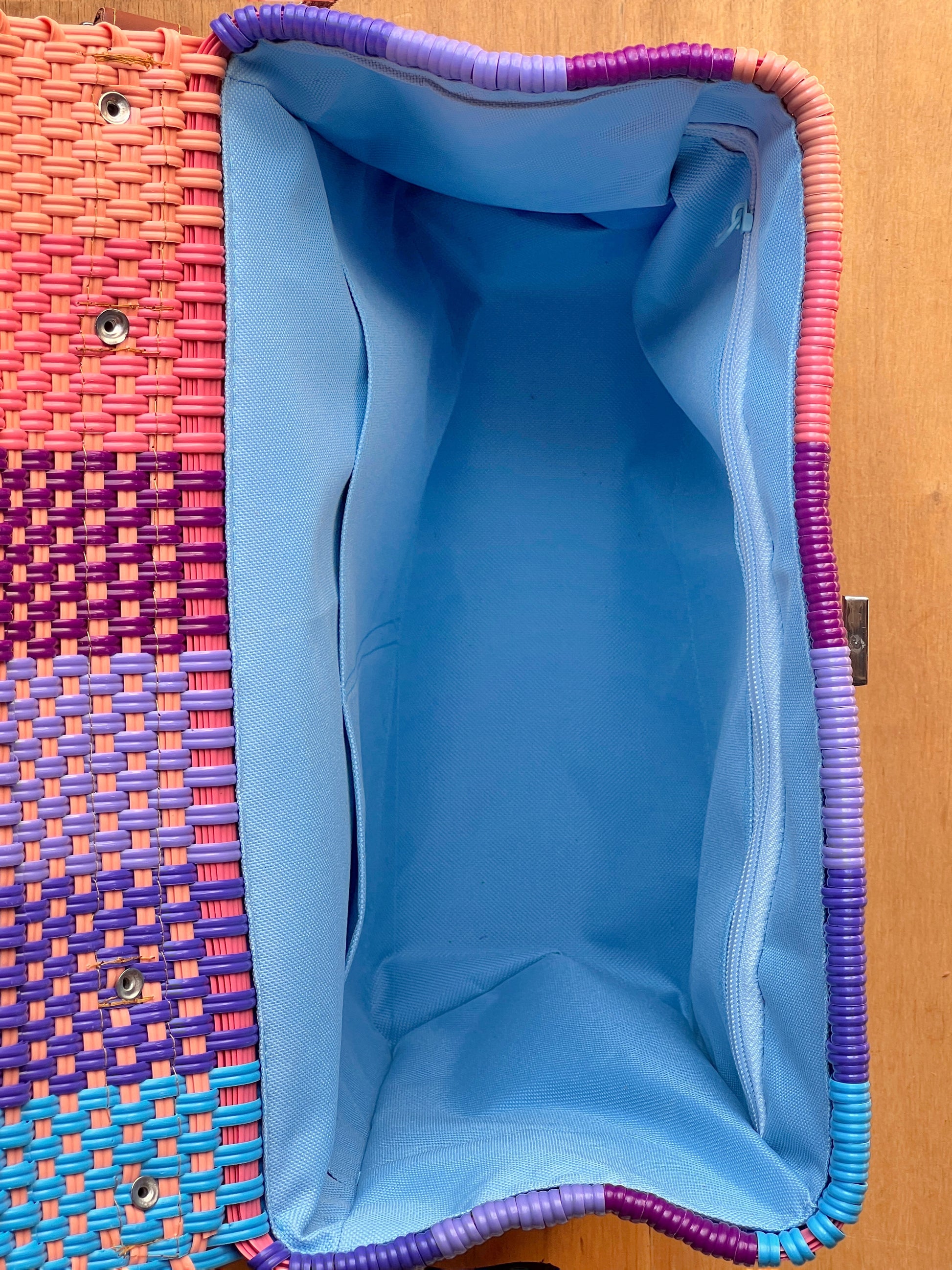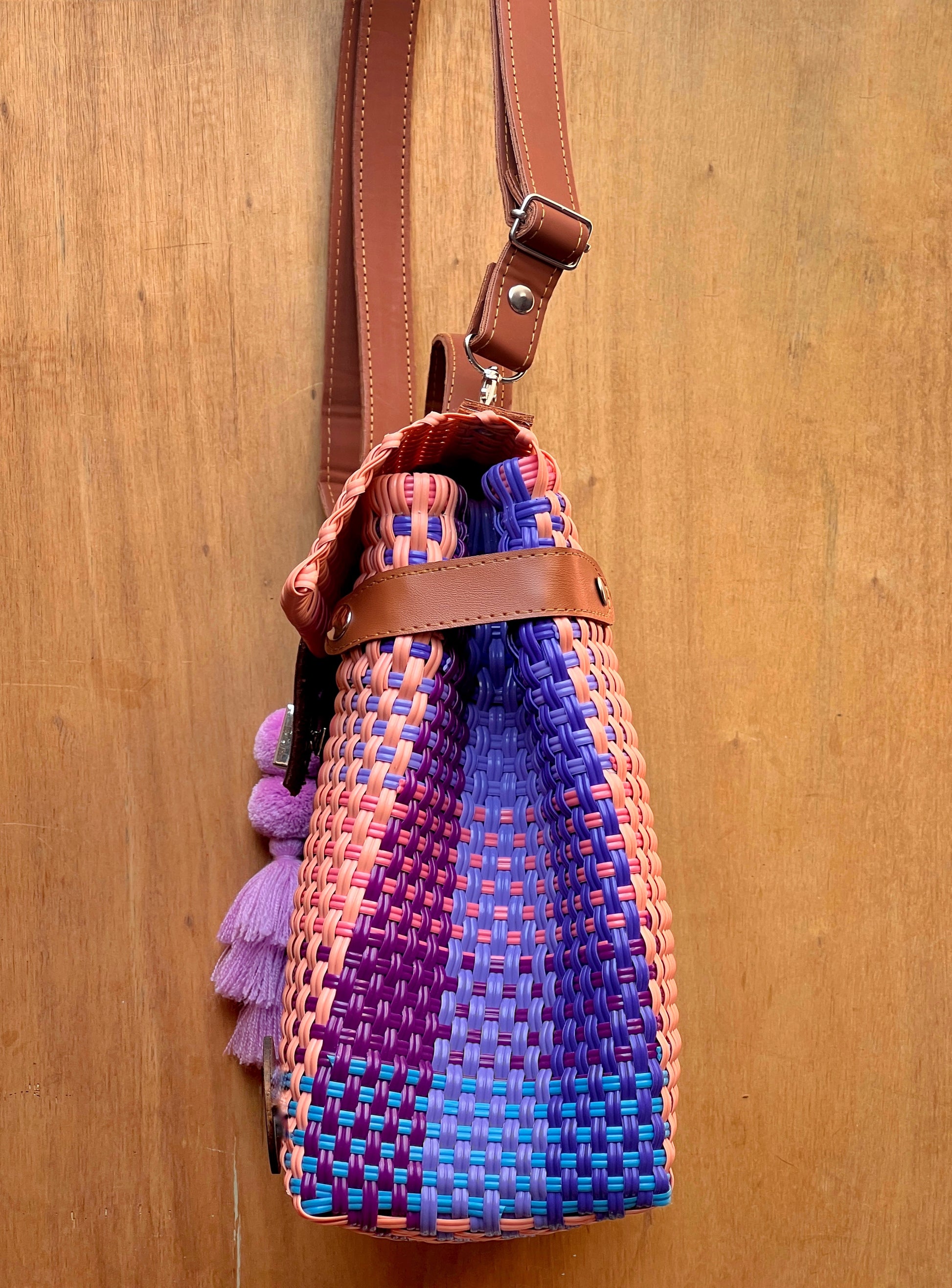 Tejida con plástico reciclado ♻️por fuera con detalles de piel, también viene con una bolsita cubre polvo para nunca se te maltrate👌🏻💕