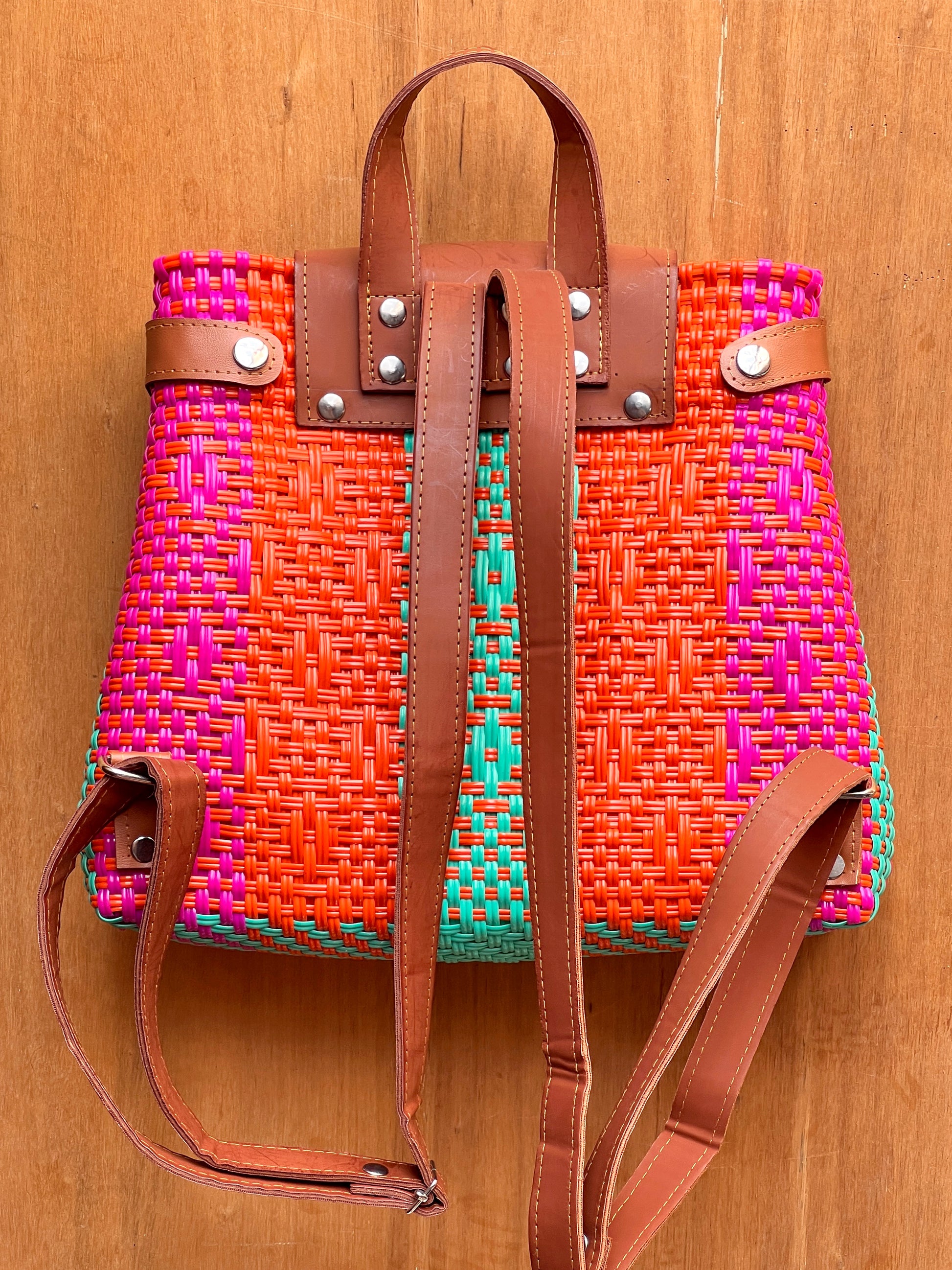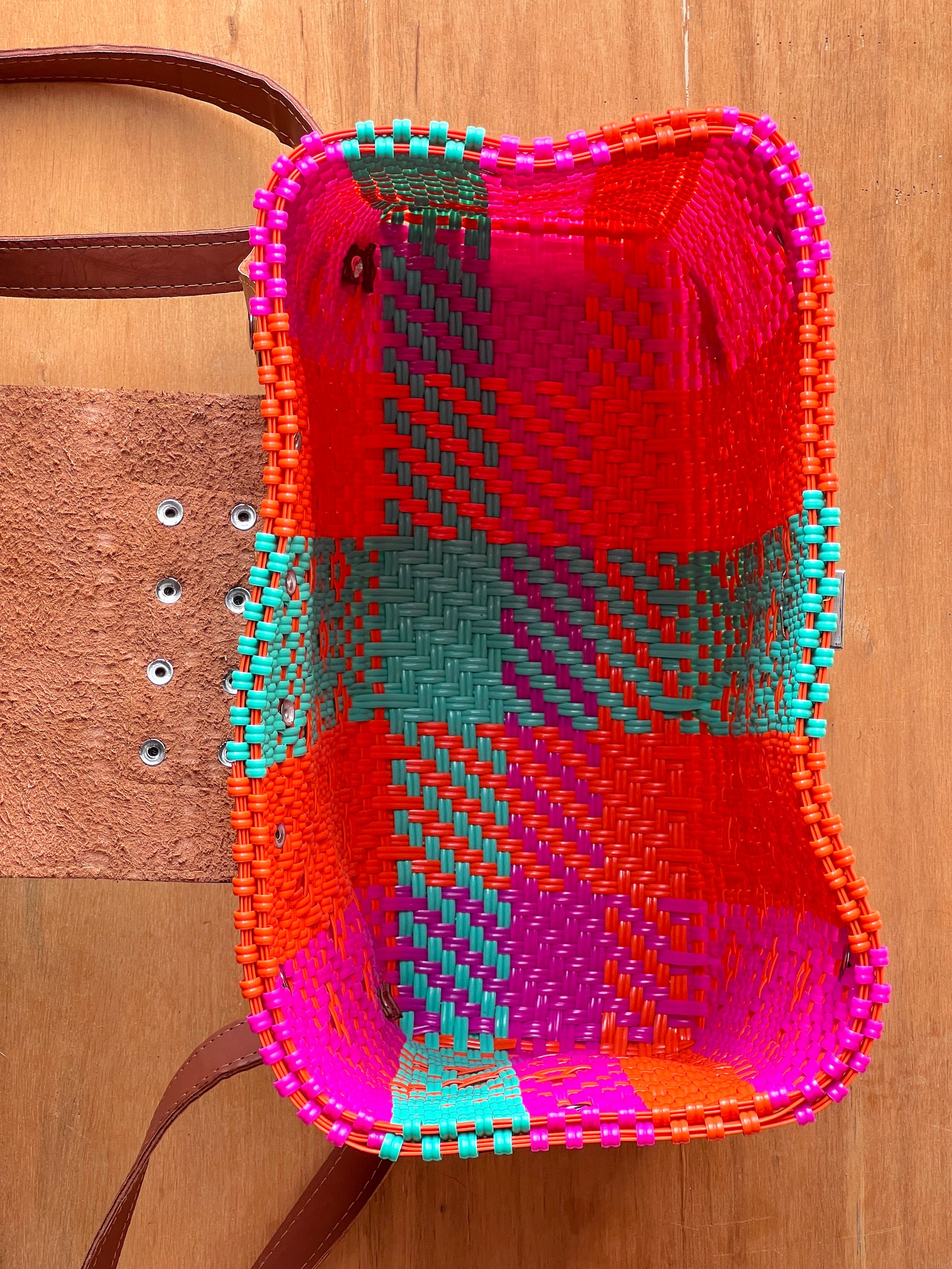 Tejida a mano con plástico reciclado ♻️, complementada con detalles de piel en la tapa y agarradera. Su diseño cuenta con broches laterales que te permiten expandirla o reducirla según lo que necesites cargar.