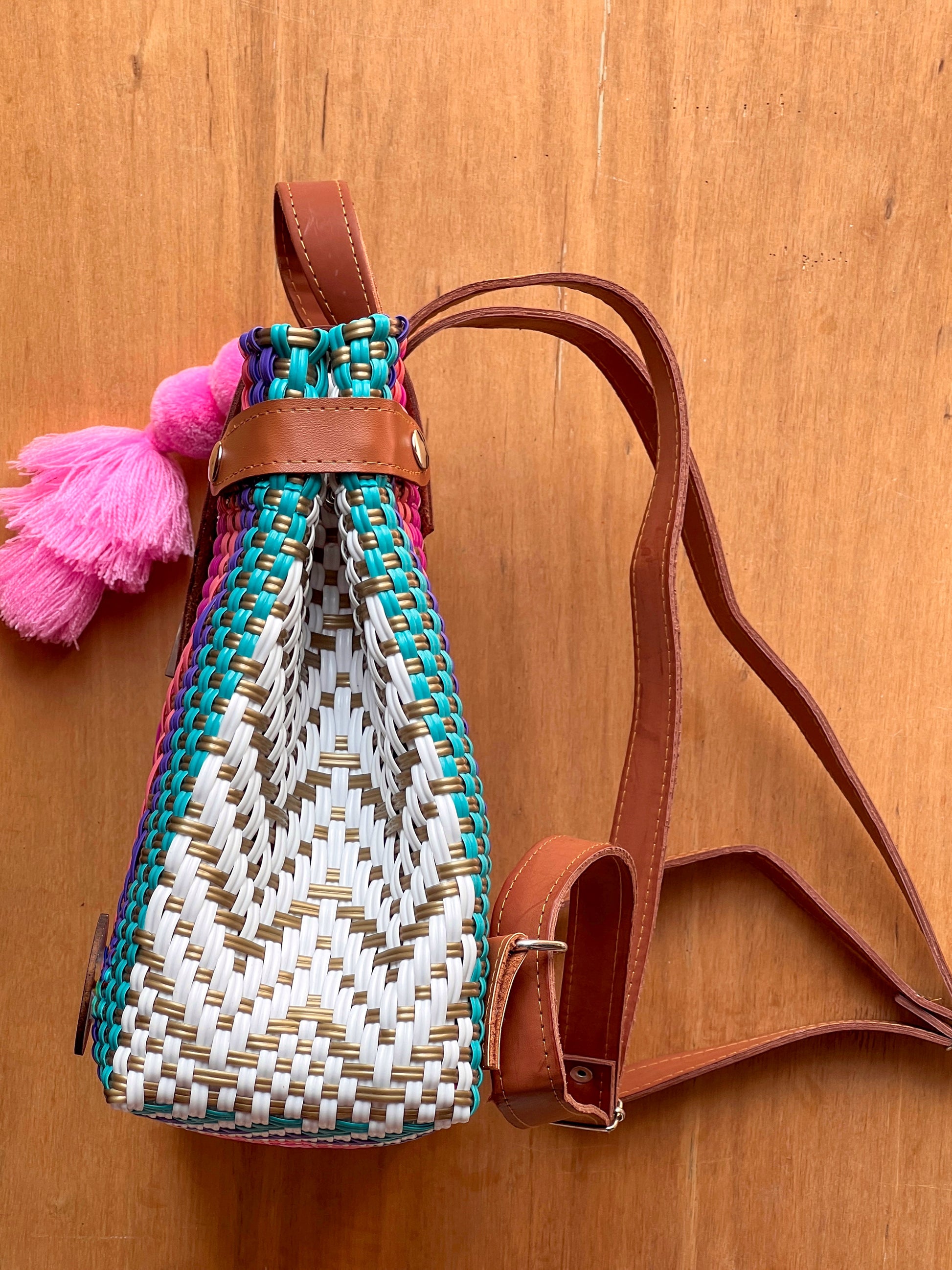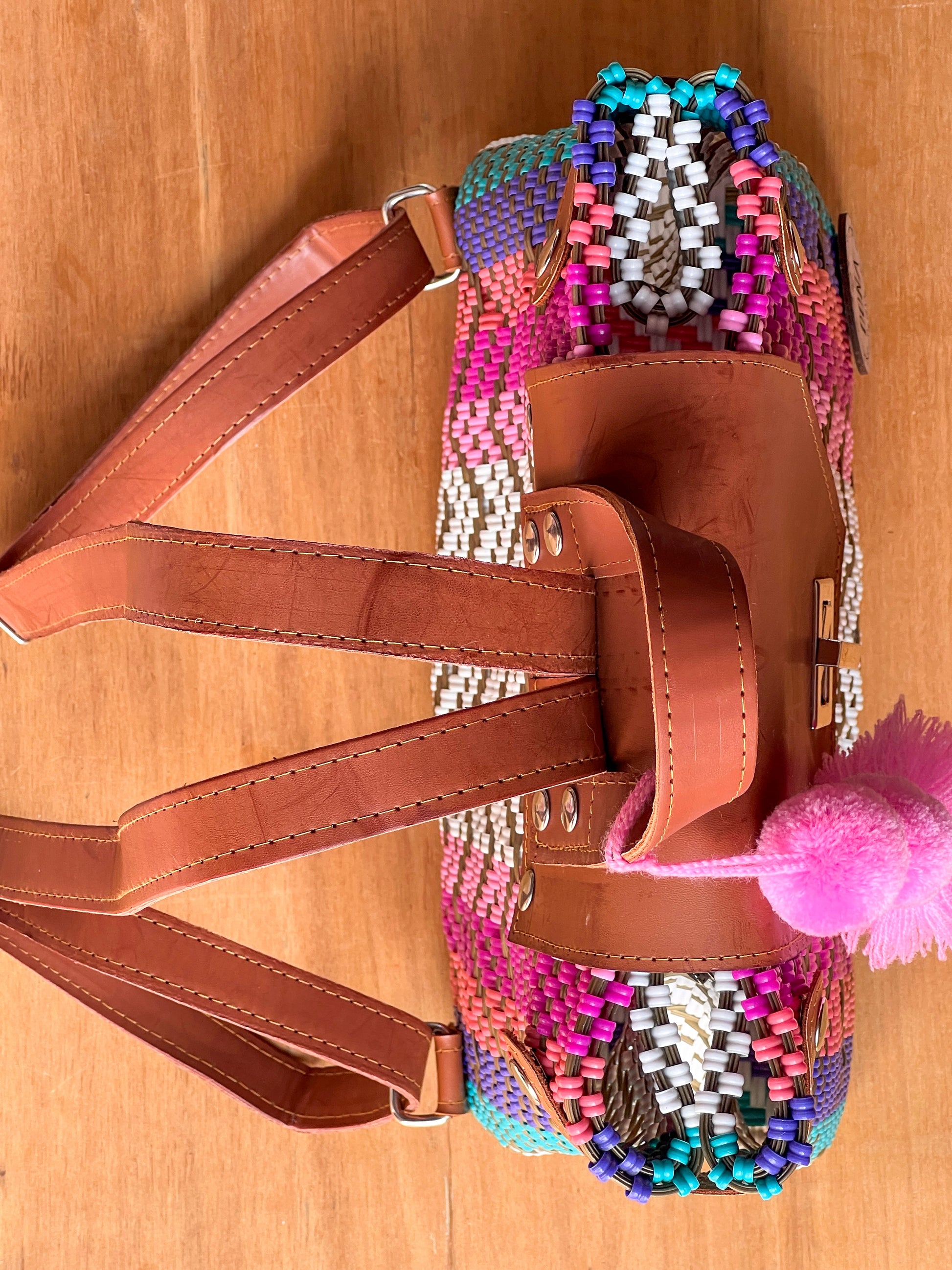 🤲🏻Tejida a mano con plástico reciclado ♻️, detalles de piel en la tapa, agarradera, broches a los lados para expandirla a los lados y hacerla más pequeña depende el espacio que necesites.