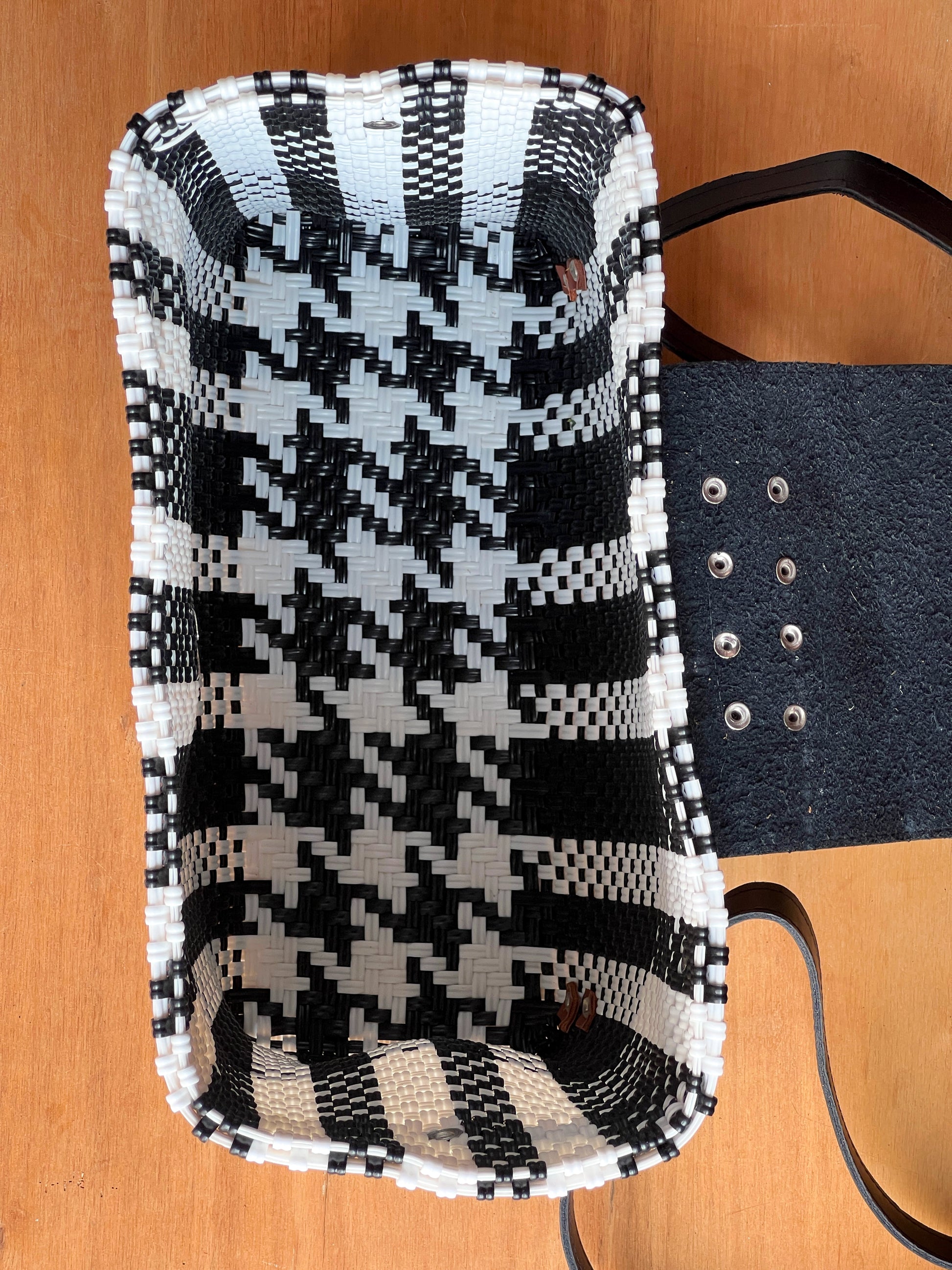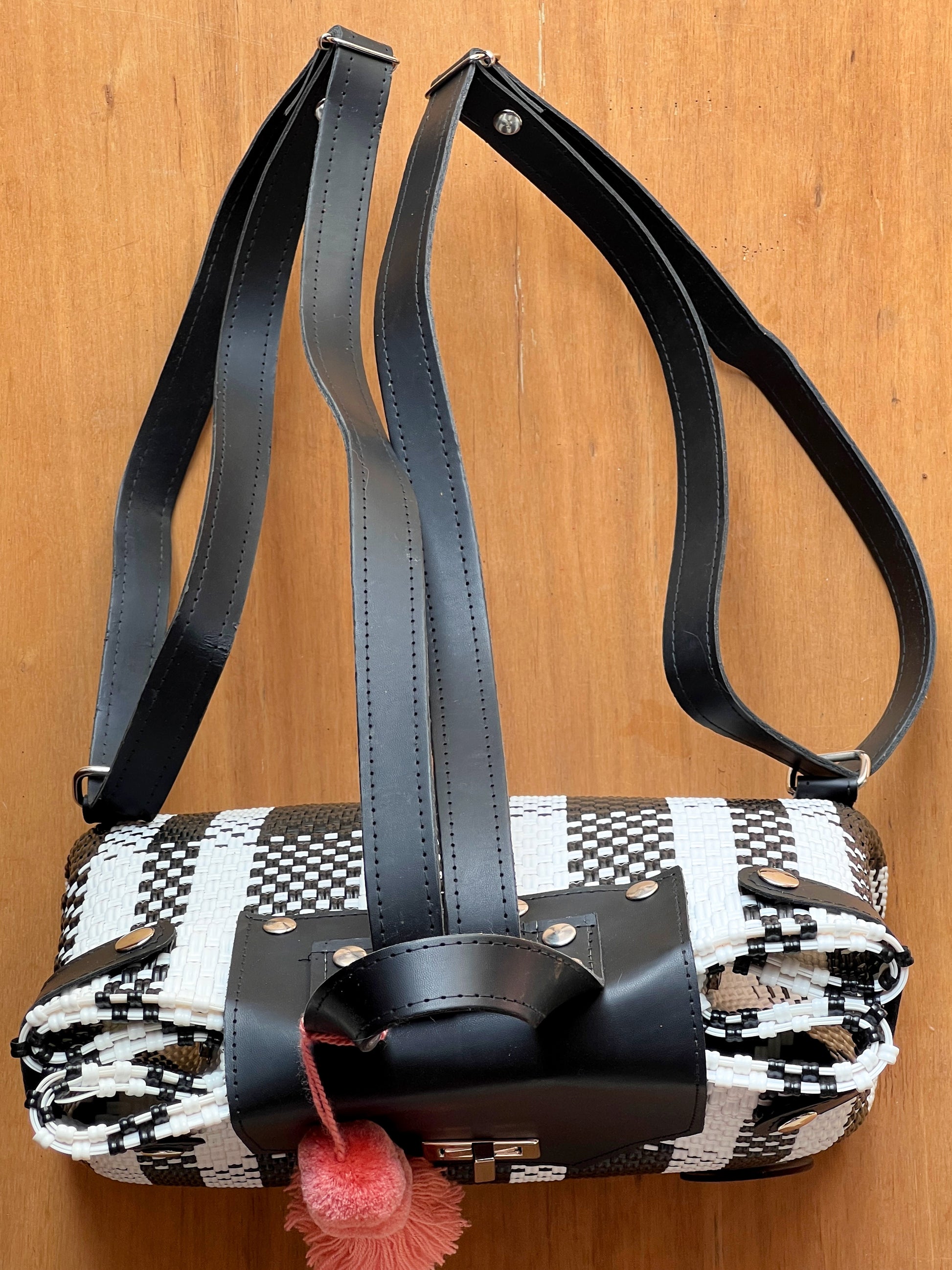 🤲🏻Tejida a mano con plástico reciclado ♻️, detalles de piel en la tapa, agarradera, broches a los lados para expandirla a los lados y hacerla más pequeña depende el espacio que necesites.